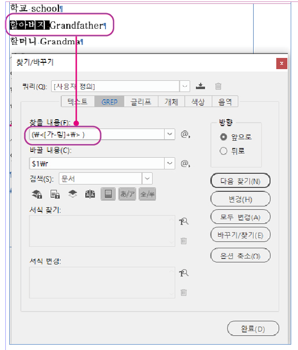 한글 뜻 옆에 영어 단어 일 때 영어 부분만 행갈이 하고 싶을 때 하는 GREP 식