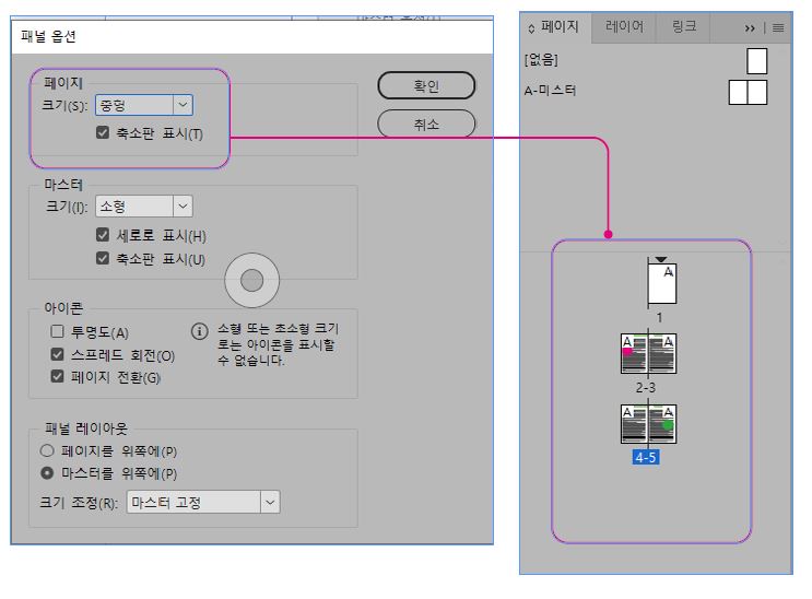 인디자인 페이지 패널 축소판 보이기 안 보이기 체크
