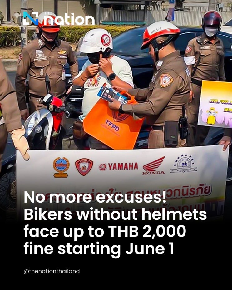 태국 왕립 경찰(RTP)에서 6월 1일부터 오토바이 운전자가 헬멧을 착용하지 않은 채 운전하면 벌금을 최...
