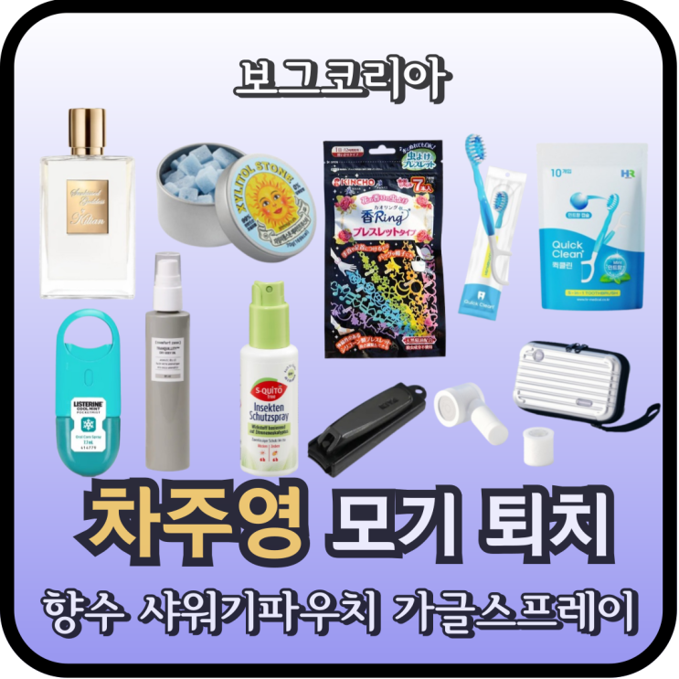 차주영 모기퇴치 약 팔찌 향수 샤워기 필터 파우치 박하사탕 가글 스프레이 손톱깎이 일회용 칫솔 바디오일 보그코리아