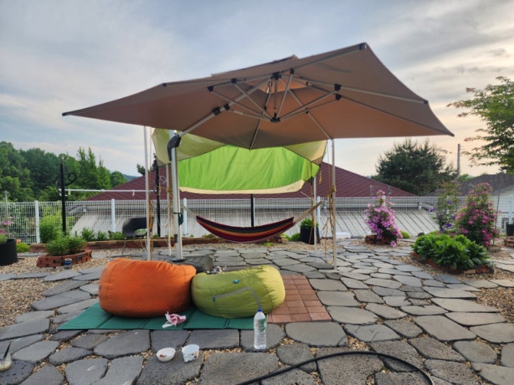전원주택 마당꾸미기의 마지막 화룡점정은 대형파라솔 크기와 제원을 비교하며 고민끝에 우리의 선택은 4세...