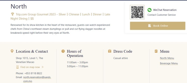 베네시안 북방관North (The Venetian Macau) 예약 및 메뉴