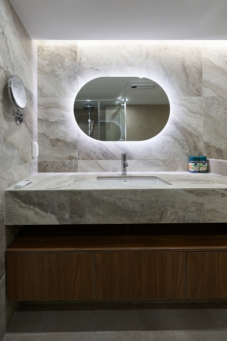 타일 카운터 세면대가 있는 욕실 욕실 벽 타일로 카운터 세면대 상판을 매치하였습니다. 대리석 결이 화려...
