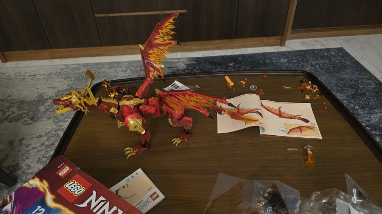 새벽에 거실로 나오니 예준이가 거의 완성 단계에 들어간 레고 ninjago dragons rising가 소파 테이블 위에...
