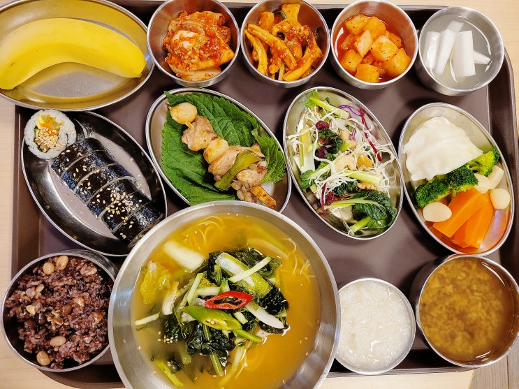 5월 14일 (수) 중식메뉴 잡곡밥 열무물옥수수국수 김밥 닭꼬치구이 견과류샐러드 모듬숙쌈 오징어무무침 배...