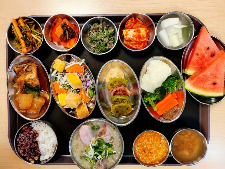 5월 19일 (월) 중식메뉴 백미잡곡밥 닭녹두죽 자반고등어무조림 삼색연근전 열대과일샐러드 모듬숙쌈 오징...