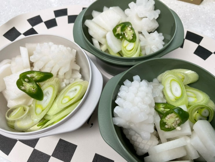 오징어무국, 어묵국, 미소된장국 아침국으로 할 것들 밀키트로 미리 준비했어요. 냉동실에 한 개 남은 우동...