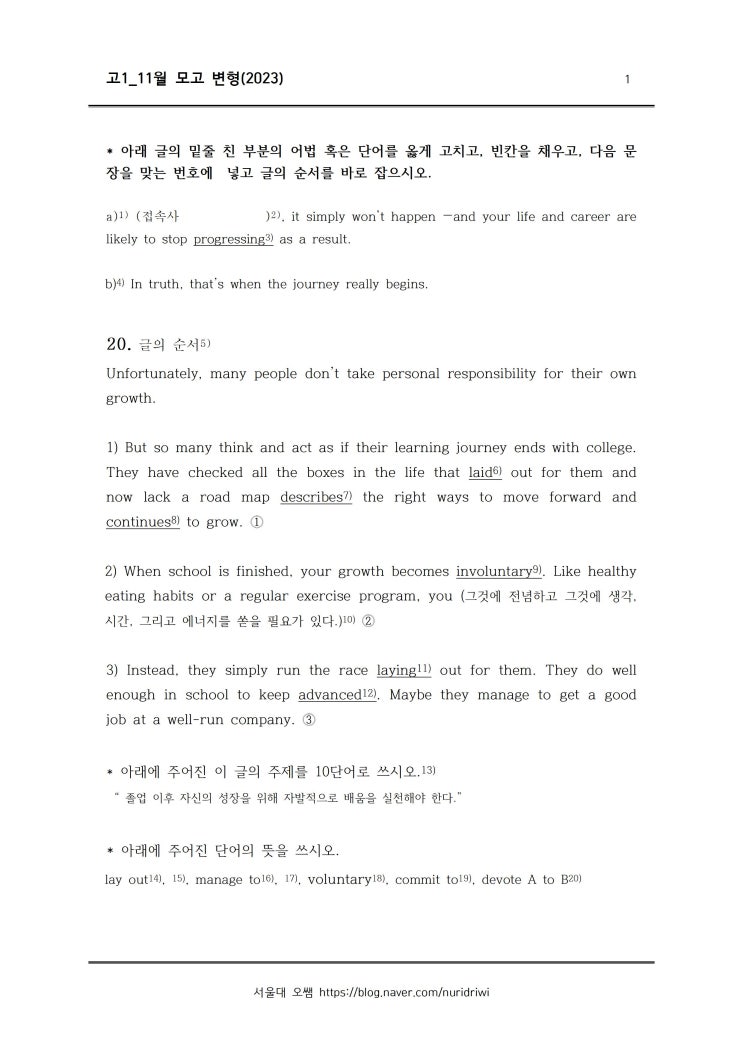* 아래에 2023년 11월 고1 모의고사 영어 변형문제 20번부터 24번까지를 배포용 파일로 공개합니다. * 한 ...