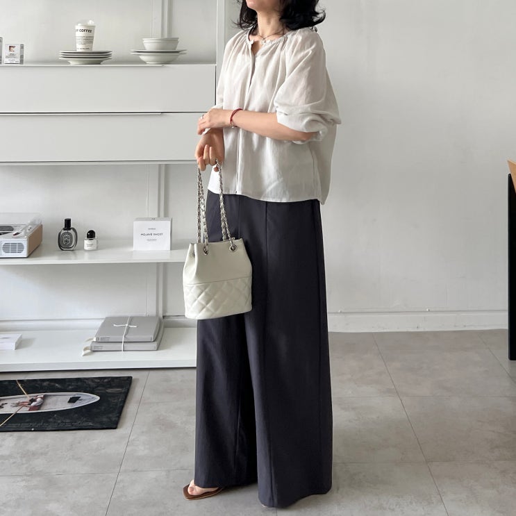 쿨한 여유가 있는 키작녀슬랙스 추천이에요~ 시스루블라우스코디 / 40대여성쇼핑몰 출근룩 하객룩