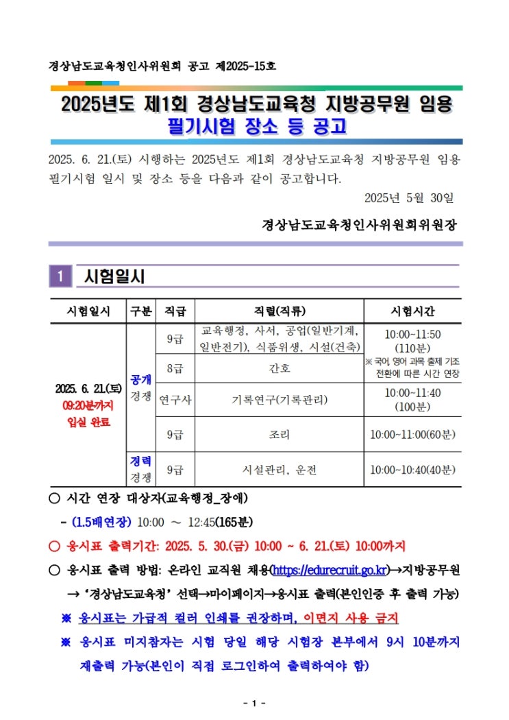 경상남도교육청인사위원회 공고 제2025-15호 2025년도 제1회 경상남도교육청 지방공무원 임용 필기시험 장...