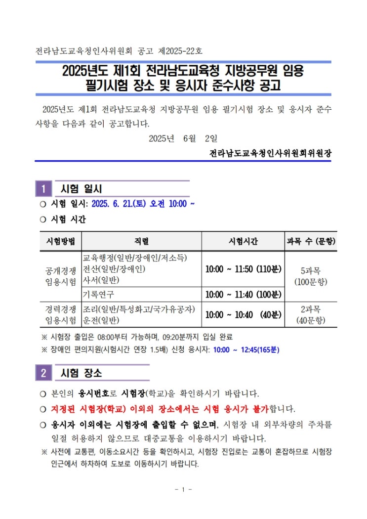 2025년도 제1회 전라남도교육청 지방공무원 임용 필기시험 장소 및 응시자 준수사항 공고