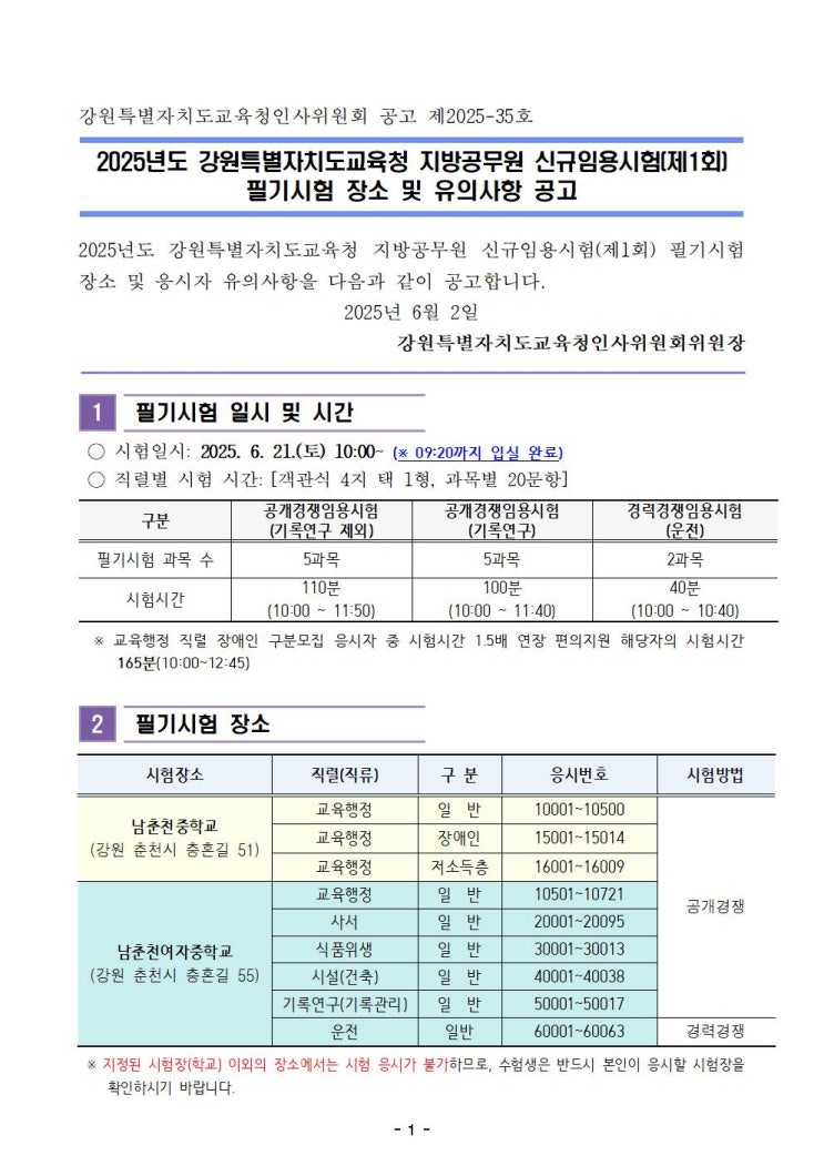 2025년도 강원특별자치도교육청 지방공무원 신규임용시험 필기시험 장소 및 유의사항 공고문