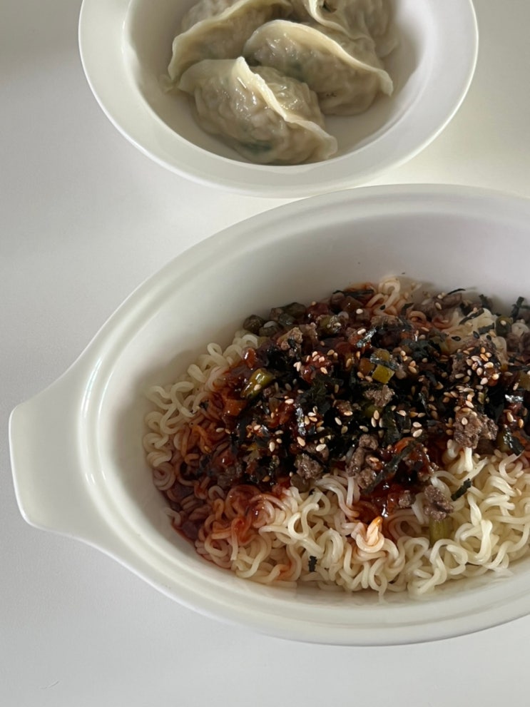 6월 집밥 / 주간밥상 더워지니깐 자꾸 면이 땡긴다.. 비빔면 + 찐만두 마늘쫑소고기볶음도 토핑으로 올려먹...