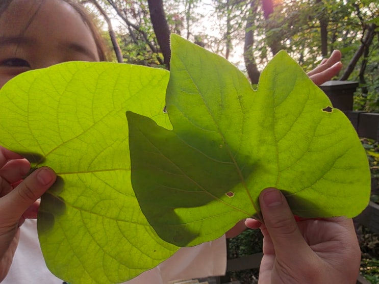 지난 목욜 숲마실 갔을 때 이렇게 놀았어요~~ 칡잎을 서너번 접어 이빨로 잘근 씹은 후 펴서 무늬 관찰하며...