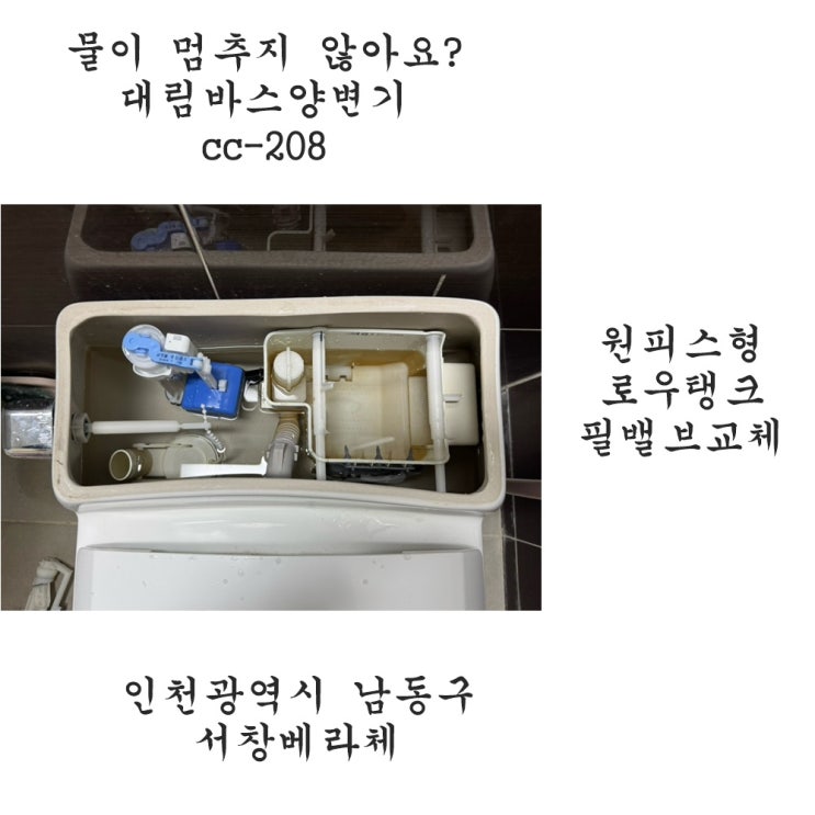 변기물이 멈추지 않아요? 변기누수. 인천 남동구 서창베라체아파트 대림바스양변기cc-208. 서창변기부속교체(필밸브)