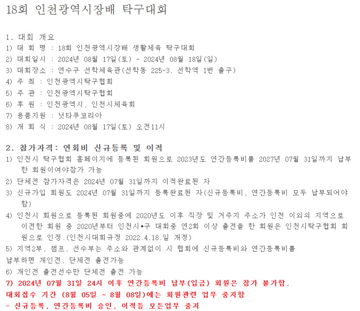 제18회 인천광역시장배 생활체육탁구대회 선학체육관으로 가자!!
