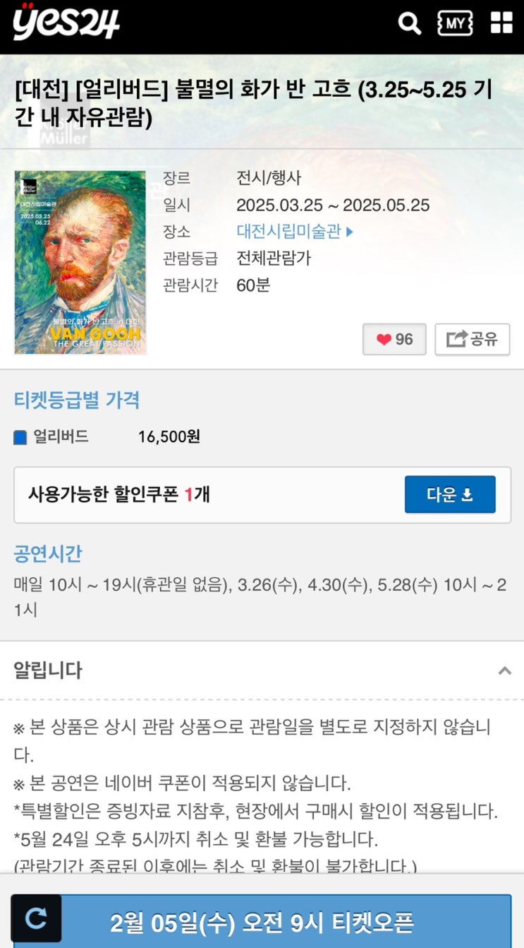 드디어 오늘 9시부터 대전시립미술관에서 열릴 반고흐 특별전 얼리버드 예매가 시작되었다. 티켓 오픈 5분 ...