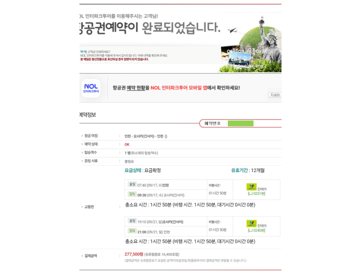 나홀로 교토여행 인천 교토 오사카 항공권 진에어 4박 결제 완료