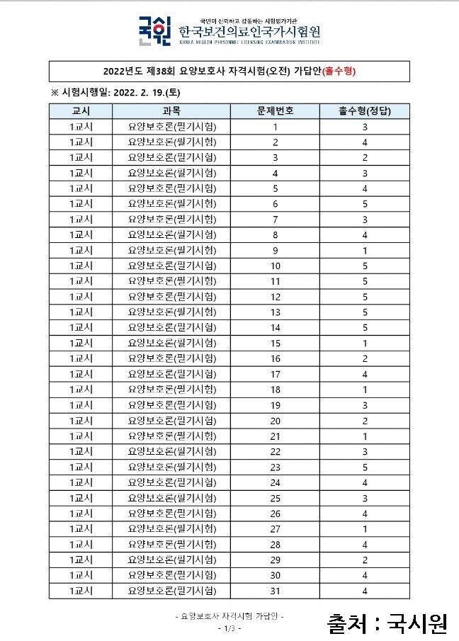 2022년 요양보호사 시험 제38회 가답안 참고하세요