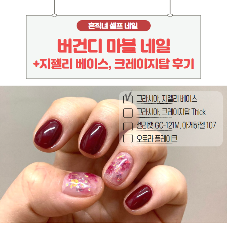 셀프 네일 #054 버건디 마블 네일, 지젤리 베이스 크레이지탑 후기