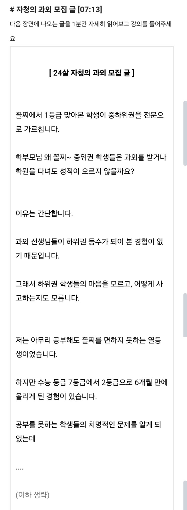 보통 과외를 구하는 글들은 의대 본과 2학년 과외합니다 주 몇회, 얼마, 어떤 과목 가능 이렇게 올리는게 ...