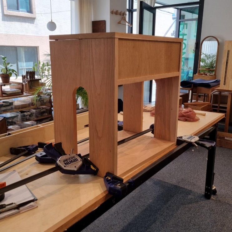 쉘터협탁 제작 2회차 지난주 1면 다듬기 완료 후 2면 다듬기 준비. 목재 방향을 옆으로 틀어야 작업하기 더...