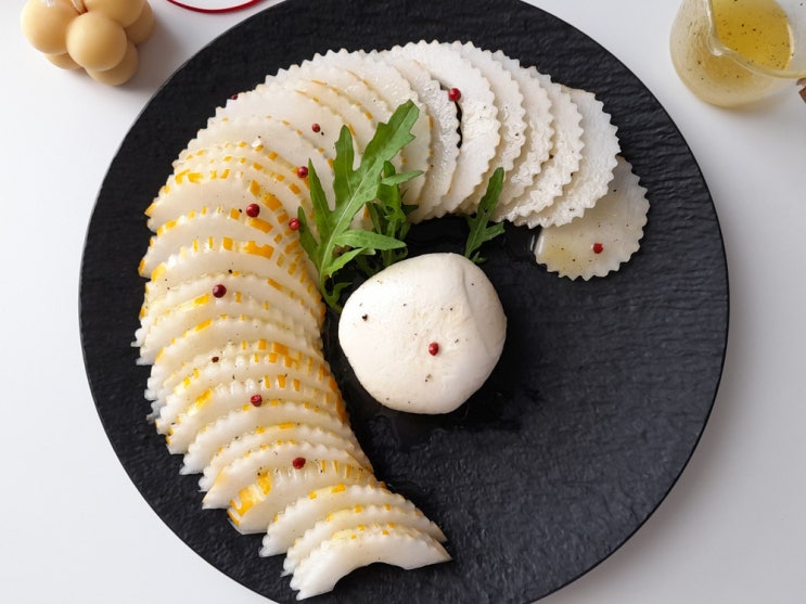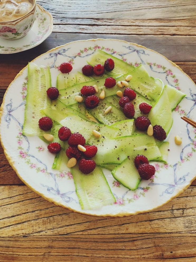 참외 슬라이스에 와이트 발사믹 + 후추추 블루베리 몇 알 오이 슬라이스 와이트 발사믹 후추추 황잣에 산딸...