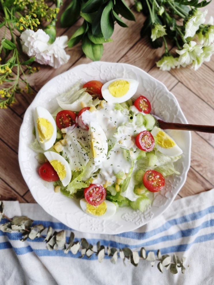 플레인요거트드레싱 양상추샐러드 소스 양상추보관중인게 있어서 계란삶고 요거트드레싱만들어 양상추샐러...