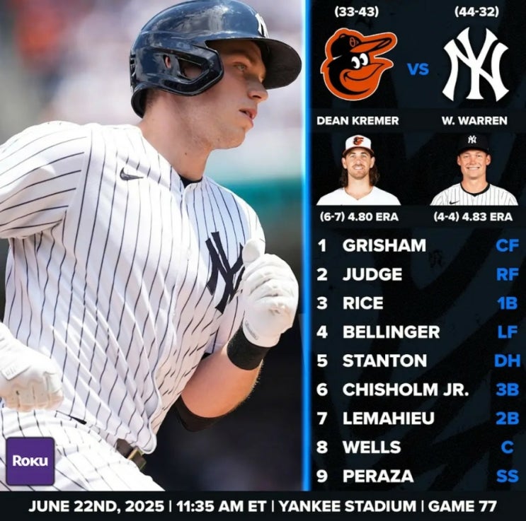 [뉴욕 양키스] 볼티모어 오리올스와의 홈 3연전 세번째 경기 선발 라인업 (2025.6.22)