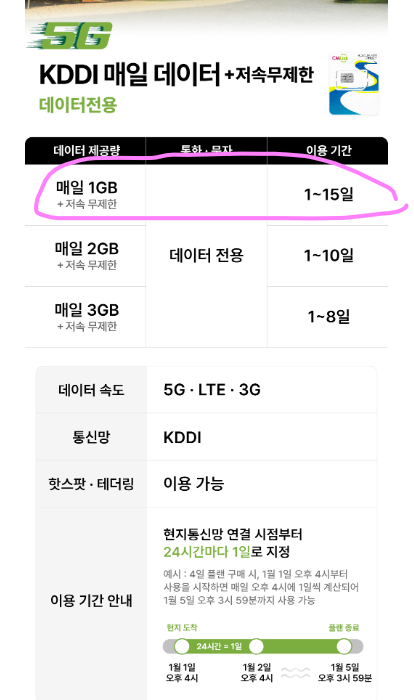 미야코지마 유심 구매 - AU(KDDI)매일 1G 데이터 + 저속무제한
