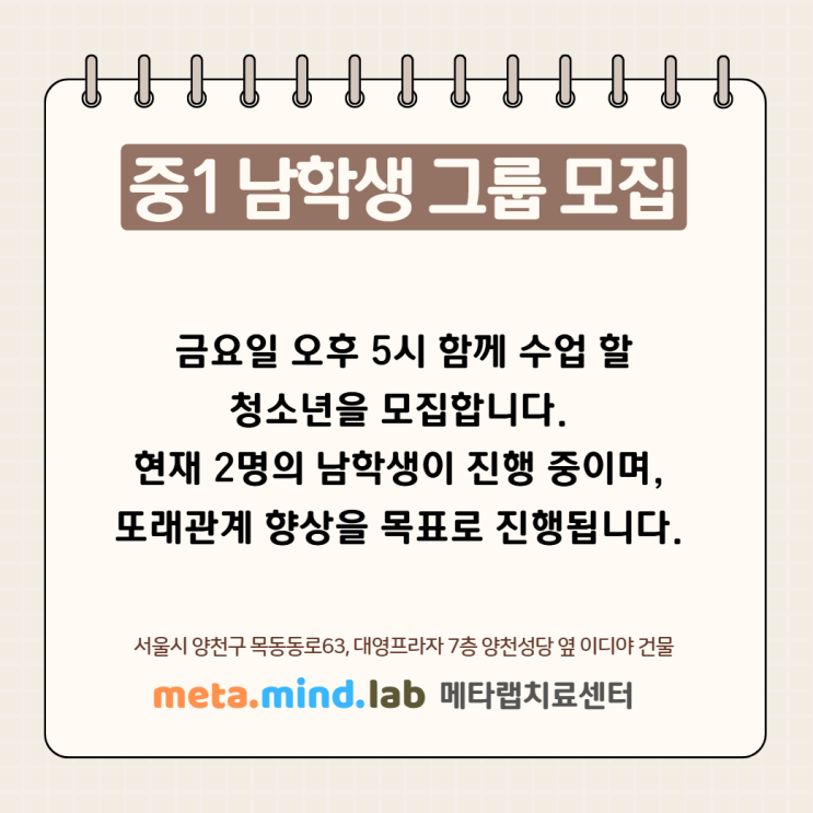 [메타랩치료센터] 사회성 그룹 참여할 남자 중학생을 모집합니다.