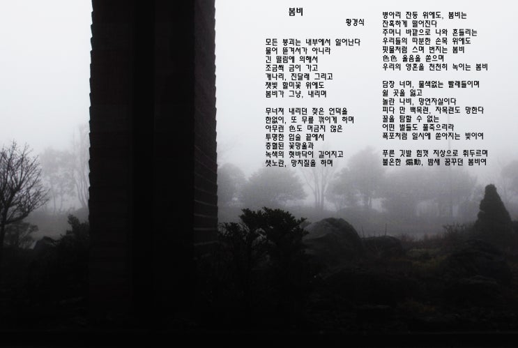 봄비 황경식 모든 붕괴는 내부에서 일어난다 물어 뜯겨서가 아니라 긴 떨림에 의해서 조금씩 금이 가고 개...