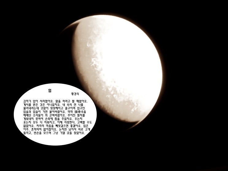 입 황경식 갑자기 입이 사라졌어요. 말을 하려고 할 때였어요. 계시를 받은 것은 아니었지요. 내 속의 먼 ...