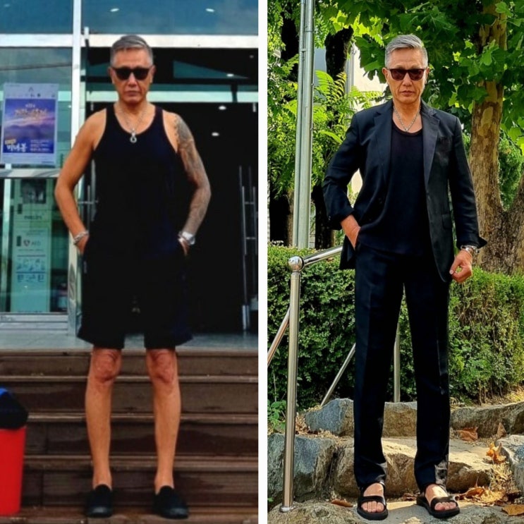불량소년 2025년 6월 18일 월요일(가조 백두산 천지온천:민소매 나시 셔츠,반바지,슬립온,바람막이 후드 점퍼)과 19일 화요일(리넨 슈트 정장,가죽 샌들) 올블랙 데일리룩