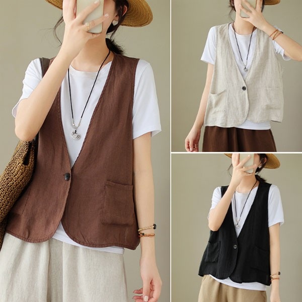 #썸머 #원버튼 #린넨조끼 #여성 #여름 #베이지 #브라운 #블랙 #베스트 #브이넥 #빅사이즈 #면마 #린넨 #조...
