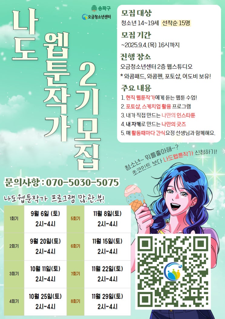 안녕하세요. 오금청소년센터입니다! 나도 웹툰작가 2기 참가 청소년을 모집합니다! 현직 웹툰 작가님과 함...
