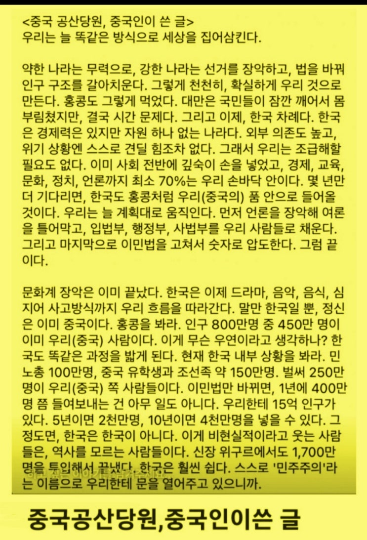 우리가 윤 어게인 외치는 이유는 바로 이것 중국 공산당원이 쓴 글에 자세히 나와 있어요. 지금 대한민국은...