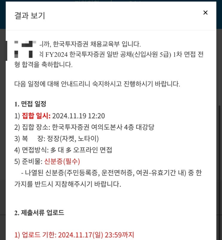 [취준 기록] 한국투자증권 1차 면접 & 합격 (2024.11.07 & 11.12)