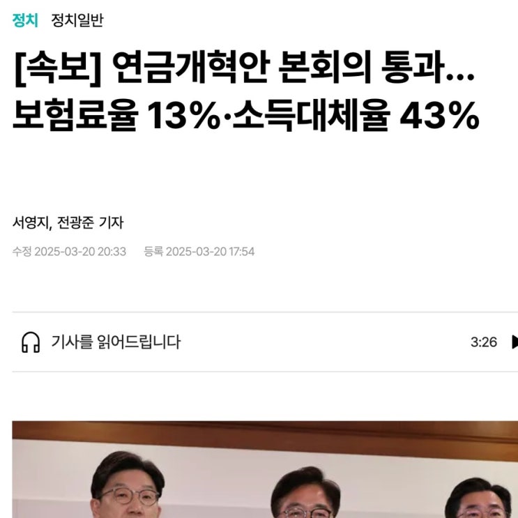 국민연금 보험료율과 소득대체율을 각각 13%, 43%로 올리는 연금개혁안이 20일 국회 본회의를 통과했다. 국...