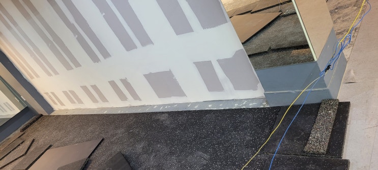 창문 쪽 공간에 데코타일을 붙였습니다. (포인트 및 방수) 헬스장 인테리어를 할 때, 창문 쪽에 가벽을 두...