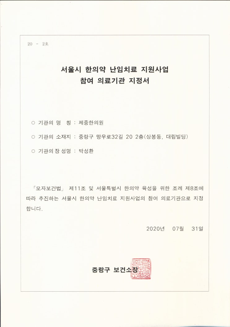 서울시 한의약 난임치료 지원 사업 참여 의료기관으로 지정되었습니다.