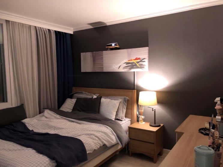 6년차 침실 모습입니다 : ) 타공 도어를 열고 들어가면 제가 셀프 페인팅한 그레이 벽부가 무게감 있게 똭!...