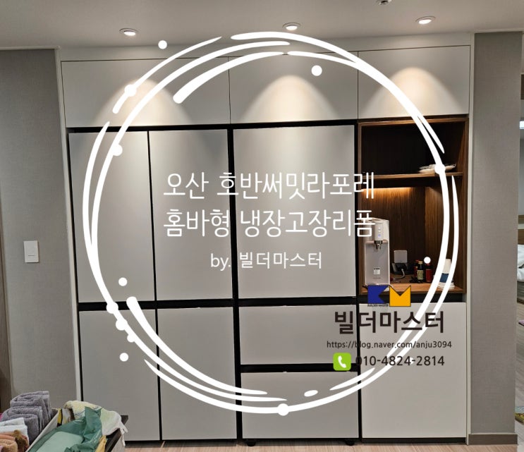 <빌더마스터> 오산 호반 써밋 라포레 홈바형 냉장고장 리폼, 비스포크&오브제 키친핏 시공업체, 싱크대 상부장 몰딩 시공