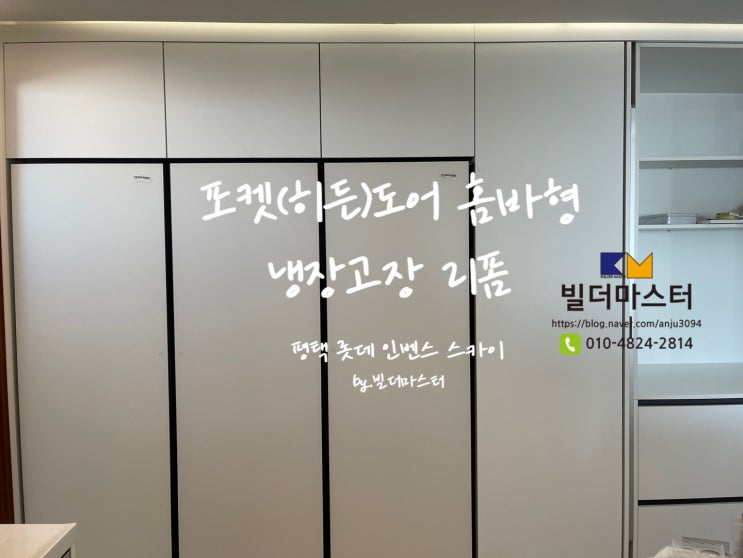 <빌더마스터> 평택 롯데 인벤스 스카이 오브제 냉장고 빌트인장 전체 철거 시공, 포켓도어(히든도어) 홈바형 냉장고장 리폼