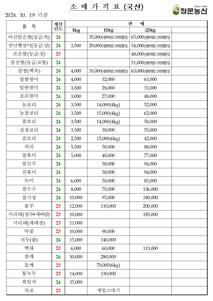 [정문농산]곡식가격표-소매(24.10.19)