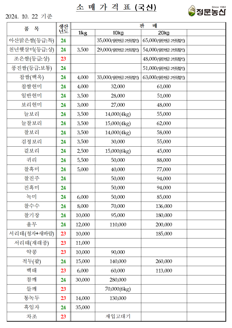 [정문농산]곡식가격표-소매(24.10.22)