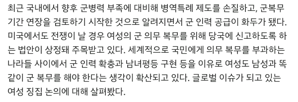 "양성평등 병력 증원" 여성 징병제 글로벌 이슈로