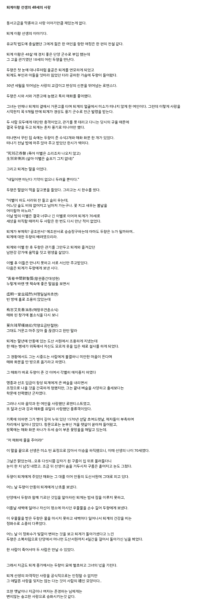 퇴계와 두향의 지고지순한 사랑