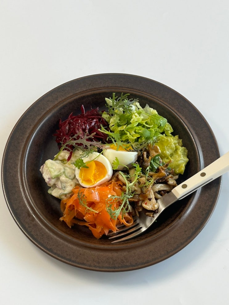 1. 당근라페 2. 비트라페 3.감자오이샐러드 4.삶은 렌틸 5. 삶은 계란 6.아보카도 7.미니 로메인 8. 버섯 ...
