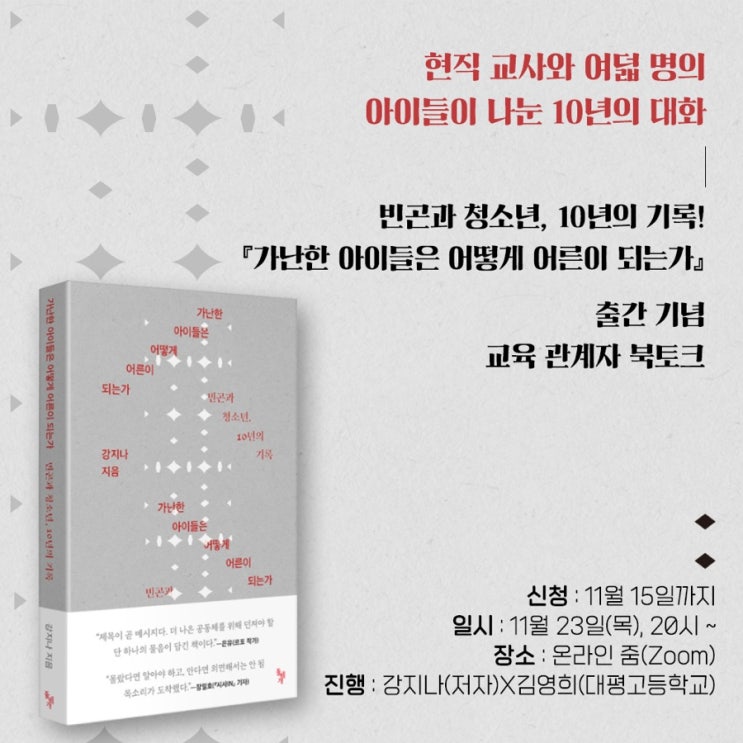 『가난한 아이들은 어떻게 어른이 되는가』 출간 기념 교육 관계자 북토크를 진행합니다. 선착순 100분을 ...
